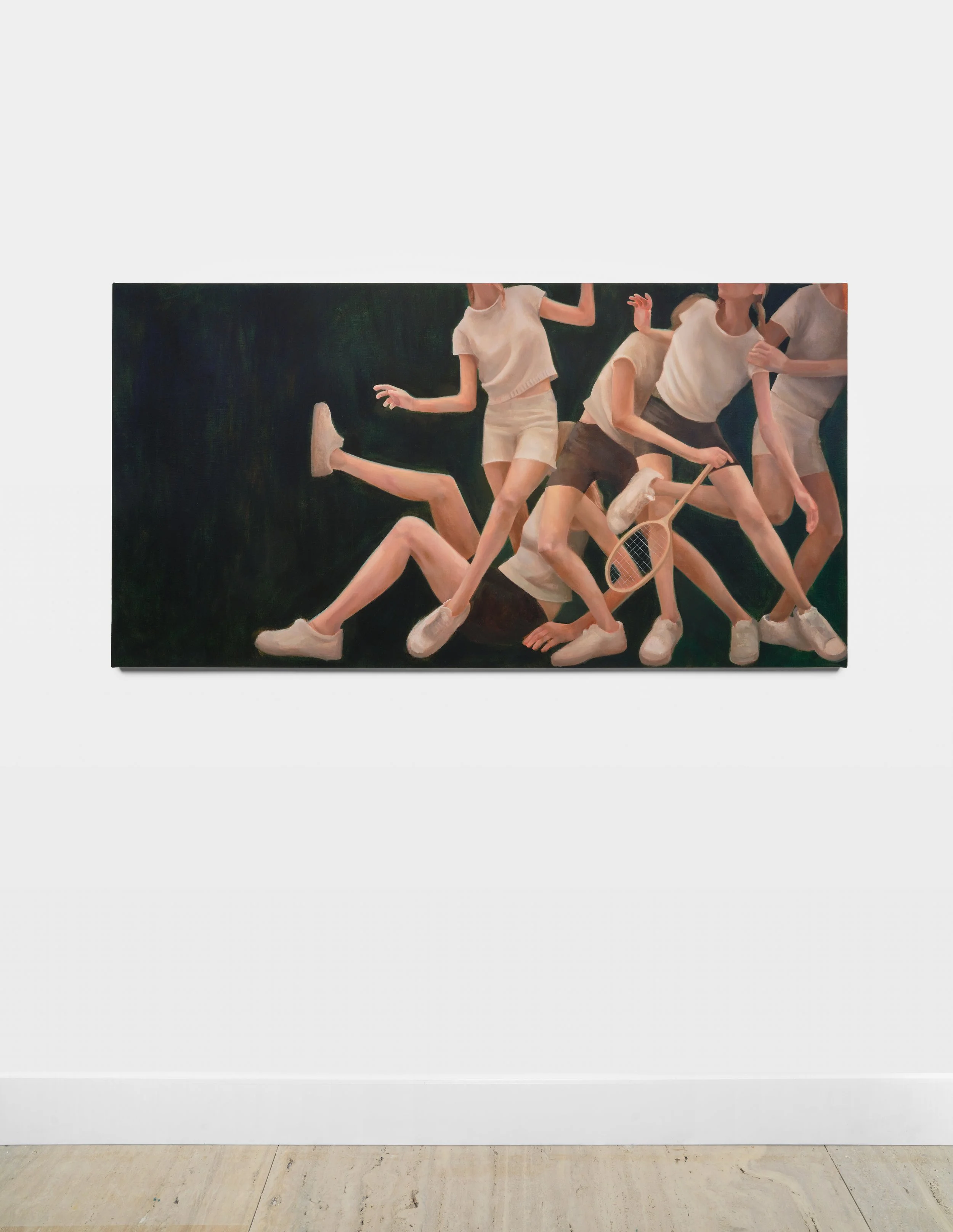 Lowen dissects the mental rigor and existential underpinnings of the sport, viewing it as a microcosm of human struggle—where precision, repetition, and control are both liberating and confining—a reference to scholarship on sport and sports psychology, such as David Foster Wallace’s collection of essays written on tennis titled “String Theory”. Her entangled figures, set within formalized social structures, challenge perceptions of societal norms and boundaries. Inspired by the dynamic battle scenes of Peter Paul Rubens and Old Master studies, Lowen reinterprets these influences through a contemporary lens, crafting a haunting critique of polite society’s suppression of passion and aggression.